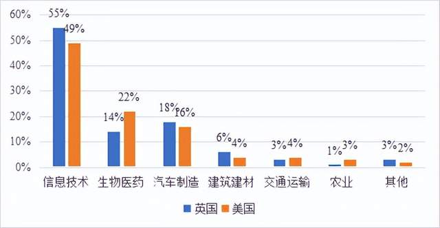 从图2显示的数据可以看出,在英国信息技术、生物医药、汽车制造和建材的SEP许可案例占比93%,在美国四个领域占比91%。