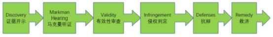 在美国,法院的专利审理程序是按阶段推进的,不同审理阶段解决不同性质的问题,具有相互独立性,如图1所示: