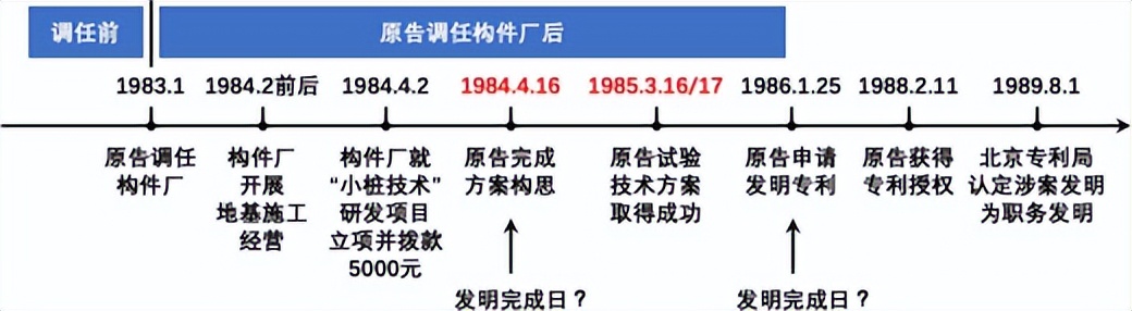 原告在 1984 年 4 月 16 日完成涉案发明技术构思后,曾在 1985 年 3 月 16 日、17 日利用被告提供的技术设备进行方案试验,并取得成功。对此,北京高院认为,“只有当发明人主要是利用了本单位的物质条件得以完成发明时,该发明创造才属职务发明创造。”“这两根试桩,是对‘钻孔压浆成桩法’技术方案的实施,显然不同于技术方案完成前对技术构思的试验。”将“发明完成”的时点界定为“发明构思完成”的时点,因而认定原告之后使用被告提供的设备的行为并不属于利用单位物质技术条件完成发明创造,这似乎过于强调了发明人对技术方案的主观确信,而完全排斥了后续的试验对发明创造的作用。