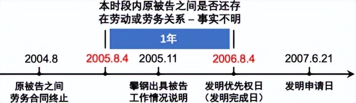 依据事实 3,原告与被告之间的劳务关系在 2004 年 8 月便已结束。然而,被告又提供了攀钢公司于 2005 年 11 月出具的《关于袁庆扬在攀钢集团钢企冷轧协力公司工作情况的说明》(事实 4),用以证明其在 2004 年 8 月与原告的劳务关系终止后,其仍然在攀钢集团继续解决切边卷取与酸洗机组的配合工作。这导致在 2004 年 8 月至 2005 年 11 月期间,原告、被告之间的劳务关系变得扑朔迷离。被告为何在劳务关系终止后仍在攀钢服务?原告与被告之间是否仍存在事实上的劳务关系?双方都未对该部分事实进行详细的举证说明。假如在这一时期内原被告之间还存在事实上的劳务关系,则结合专利的优先权日,能够认定本发明为被告从单位离职后一年内作出;若原被告自 2004 年 8 月后再无联系,则本发明为被告离职一年后作出,这显然会对职务发明的认定产生巨大的影响。然而遗憾的是,由于忽视了本案专利的优先权日,双方均未抓住这一要害之处,此其三。