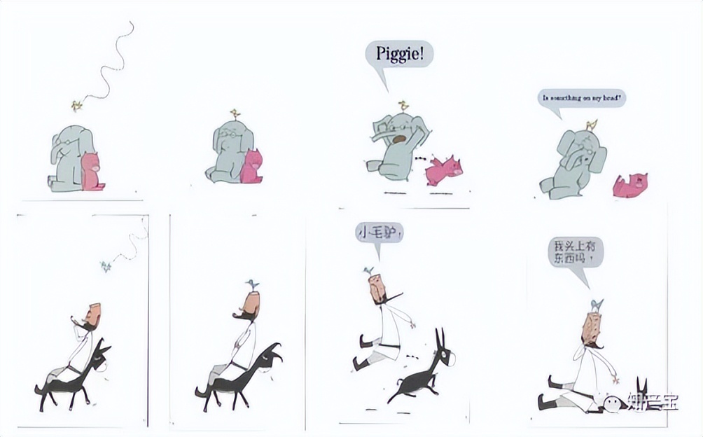 下图为案涉两个绘本部分内容的对比,上侧为绘本《开心小猪和大象哥哥》,下侧为《阿凡提和小毛驴》: