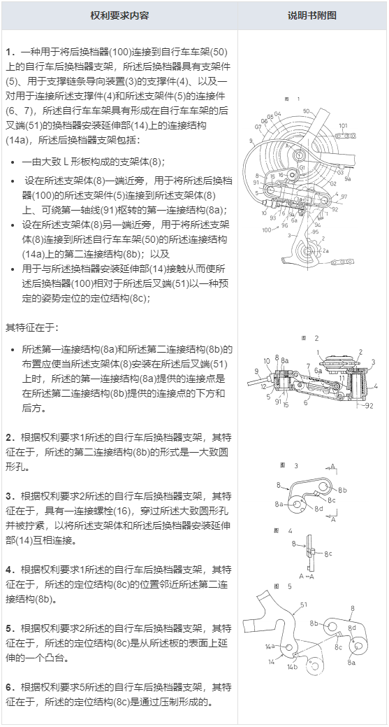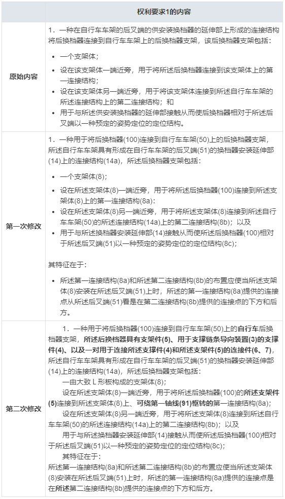 因此在第一次修改后,权利要求1增加了“所述自行车车架具有形成在自行车车架的后叉端(51)的换档器安装延伸部(14)上的连接结构(14a)”的内容,限定了自行车车架的结构,而在被第二次审查意见认为权利要求内容依旧被现有技术公开后的第二次修改中,株式会社岛野更是进一步对后换档器和自行车车架的结构、后换档器支架与二者的连接方式都做了详细的限定。