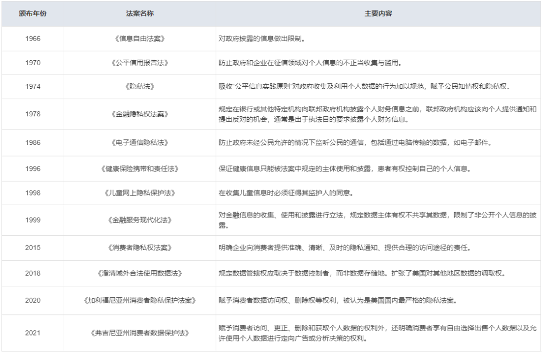3. 美国联邦层面的立法集中于儿童、金融、医疗等较为敏感且重要的领域,主要目的是为了保障公民的知情权,对可能滥用数据的主体进行限制。