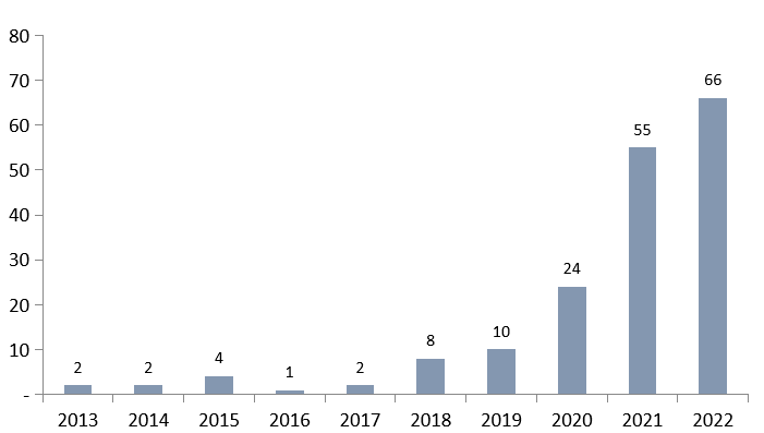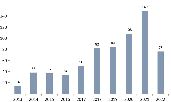 图2 2013-2022年中国药企对外授权项目数量