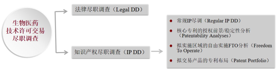 一般而言,生物医药授权许可交易中的尽职调查一般由法律尽职调查(Legal Due Diligence,简称Legal DD)及知识产权尽职调查(Intellectual Property Due Diligence,简称IP DD)两部分组成。
