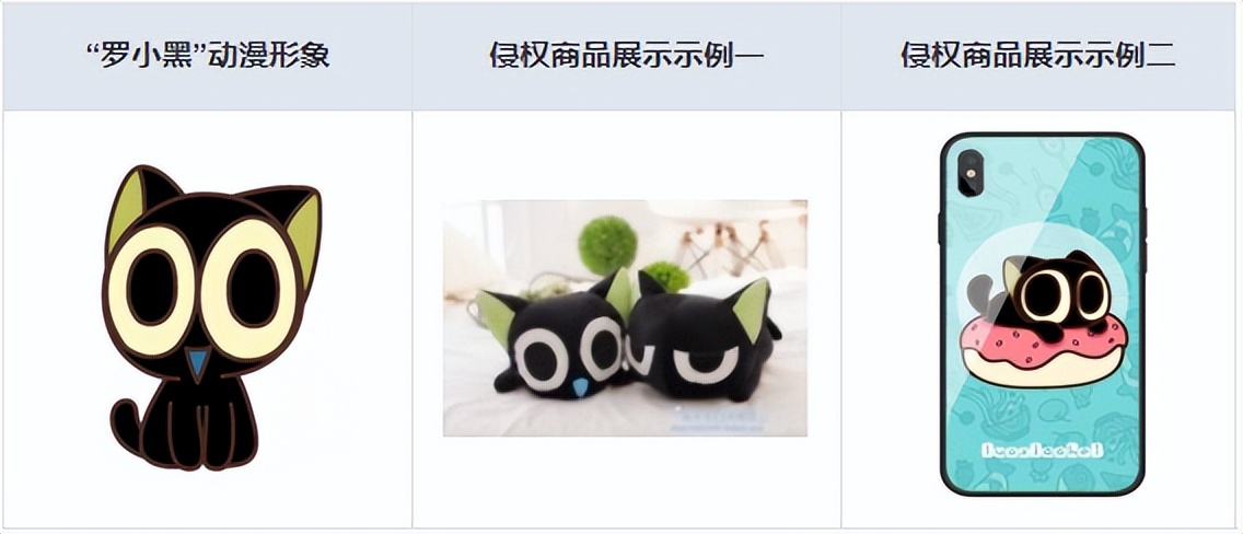 以“罗小黑”动漫形象侵权案件为例,动漫形象主要通过两种方式被利用,一种是从平面到立体的利用,如将该动漫形象制作成玩具、抱枕、耳机盒等等,如下图示例一;另一种是从平面到平面的使用,这种使用主要是指在商品上印制动漫形象,如动漫形象印制在手机壳、衣服、书包等商品之上,如下图示例二。
