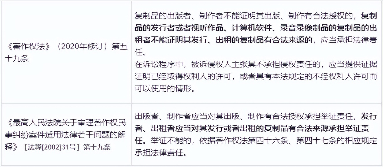 在2001年修订时,《著作权法》增加了“复制品的出版者、制作者不能证明其出版、制作有合法授权的,复制品的发行者或者视听作品、计算机软件、录音录像制品的复制品的出租者不能证明其发行、出租的复制品有合法来源的,应当承担法律责任”。该内容是关于过错推定而承担法律责任的规定,是为了充分有效地保护著作权人的权益,参照《与贸易有关的知识产权协议》第四十五条,明确了举证责任[9]。这一规定在《最高人民法院关于审理著作权民事纠纷案件适用法律若干问题的解释》【法释[2002]31号】第十九条得到重申。