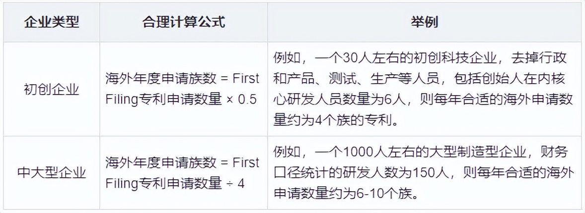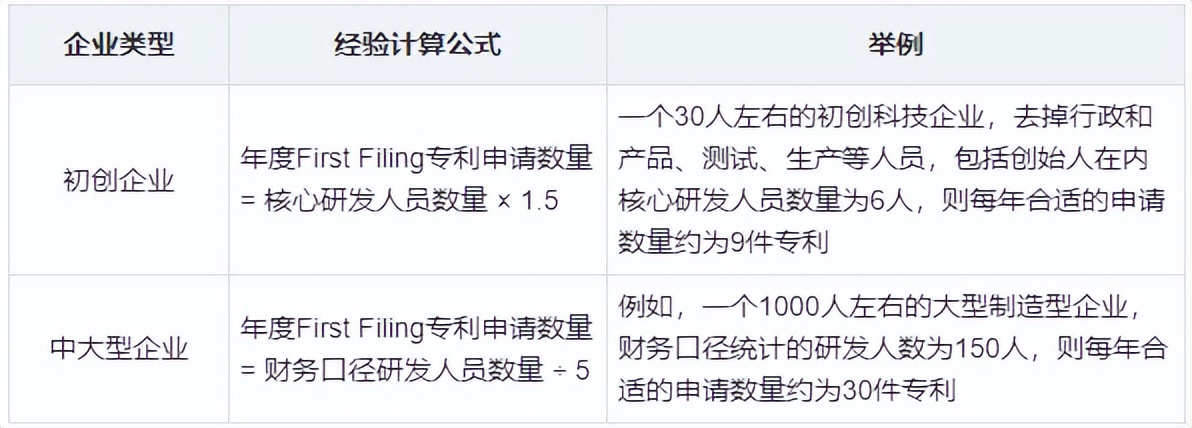 初创企业与中大型企业每年实施专利申请的数量的经验计算公式存在差异,如下表所示:
