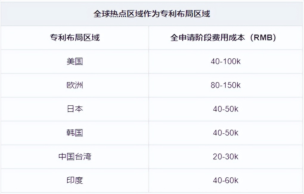 针对知识产权的布局工作,我们的思路应当从成本的考量入手,成本考虑应当尽量周详。纯国内布局和全球热点区域布局的申请阶段费用成本不在一个量级上,二者申请阶段费用成本如下: