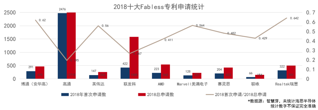 根据2018年统计的十大Fabless专利申请统计表,不难发现除了加入SEP战争的企业,其余巨头在专利申请数量上都相对克制。