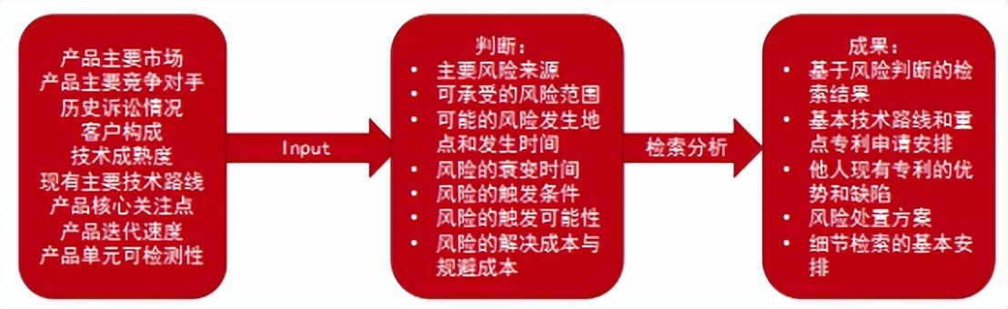 从更加科学合理的专利风险防控体系建设角度来看,我们应当把握产品预研阶段,这是规避专利风险的最黄金时间。因为预研阶段调整余地最大,要争取在预研阶段对绝大多数风险得出处置结论并付诸实施。预研阶段工作主要是将各个与产品专利布局相关的要素整合起来,判断出一些基本事实信息,最终检索分析出有助于布局判断的结果,具体如下图所示: