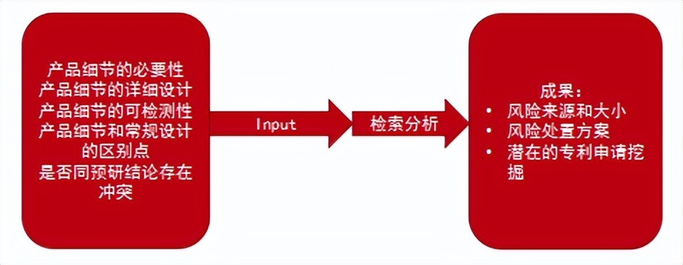 在产品研发阶段,主要针对一些技术细节的风险进行防控,基于一些产品细节状态来分析风险的来源和大小、设计风险处置方案并挖掘潜在专利申请。一般进行单点式检索,响应于研发,尽量小改动。