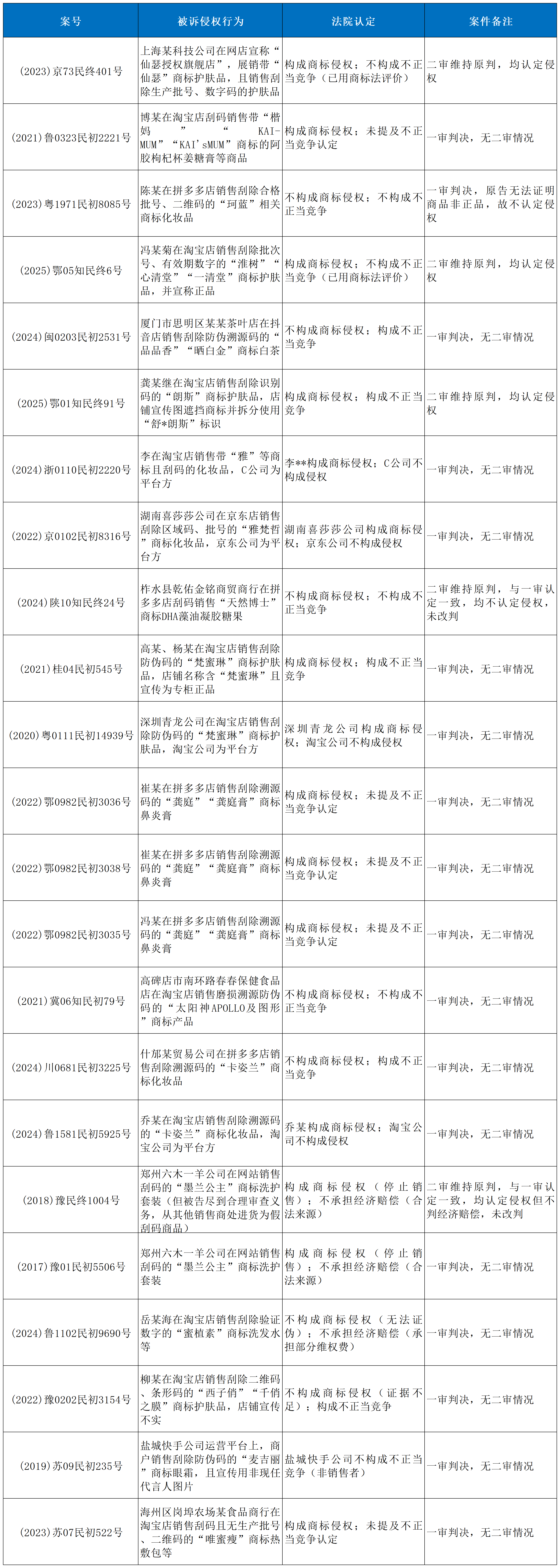 如被诉方销售的商品经核实为权利人正品(无证据证明是假冒),不侵犯商标专用权,但通过刮码、隐瞒刮码事实等行为,破坏权利人的区域销售管控、价格体系或商品溯源功能,损害品牌方管理权益及消费者知情权,扰乱市场秩序,则认定为构成不正当竞争。例如(2024)闽0203民初2531号案[11]中,厦门市思明区某某茶叶店销售的“品品香”“晒白金”白茶为正品,但刮除防伪溯源码,且未充分告知消费者刮码对防伪核验的影响,破坏品牌方溯源管理体系,同时攫取合法经销商交易机会,法院认定不构成商标侵权,仅构成不正当竞争。又如(2024)川0681民初3225号案[12]中,什邡某贸易公司销售刮除溯源码的“卡姿兰”化妆品,商品为正品但未告知消费者刮码情况,导致消费者无法溯源、品牌方无法管控渠道,法院认定构成不正当竞争,不构成商标侵权。