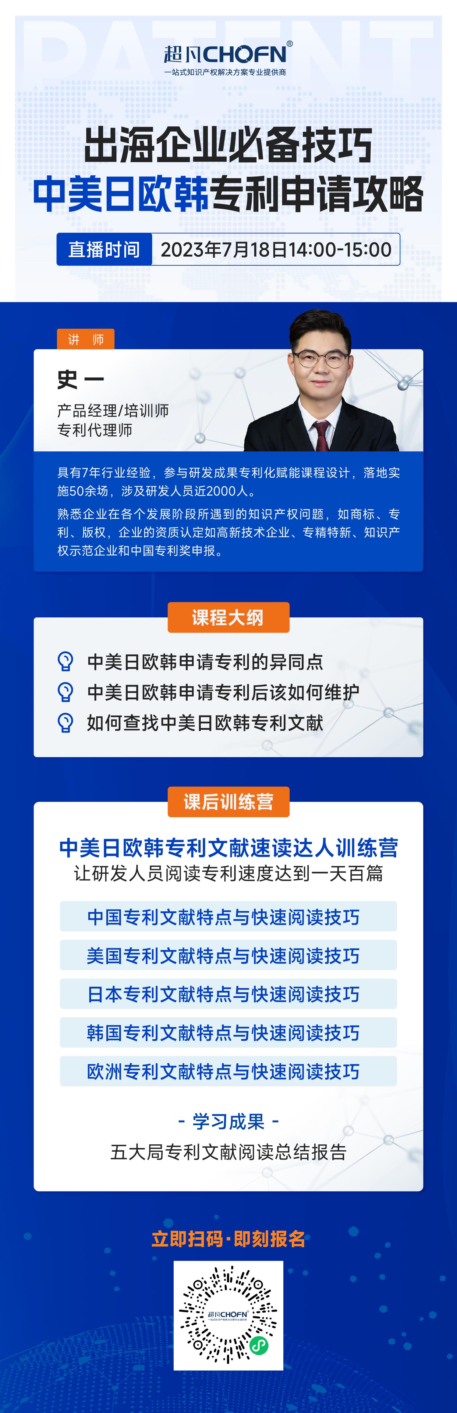 基于此,超凡知识产权特邀专利代理师史一老师,于7月18日下午14:00-15:00,在线分享《中美日欧韩专利申请攻略》,带你一次搞定五大局专利申请关键技巧,快速提升海外专利实务能力,助力企业实现更广阔的国际发展。