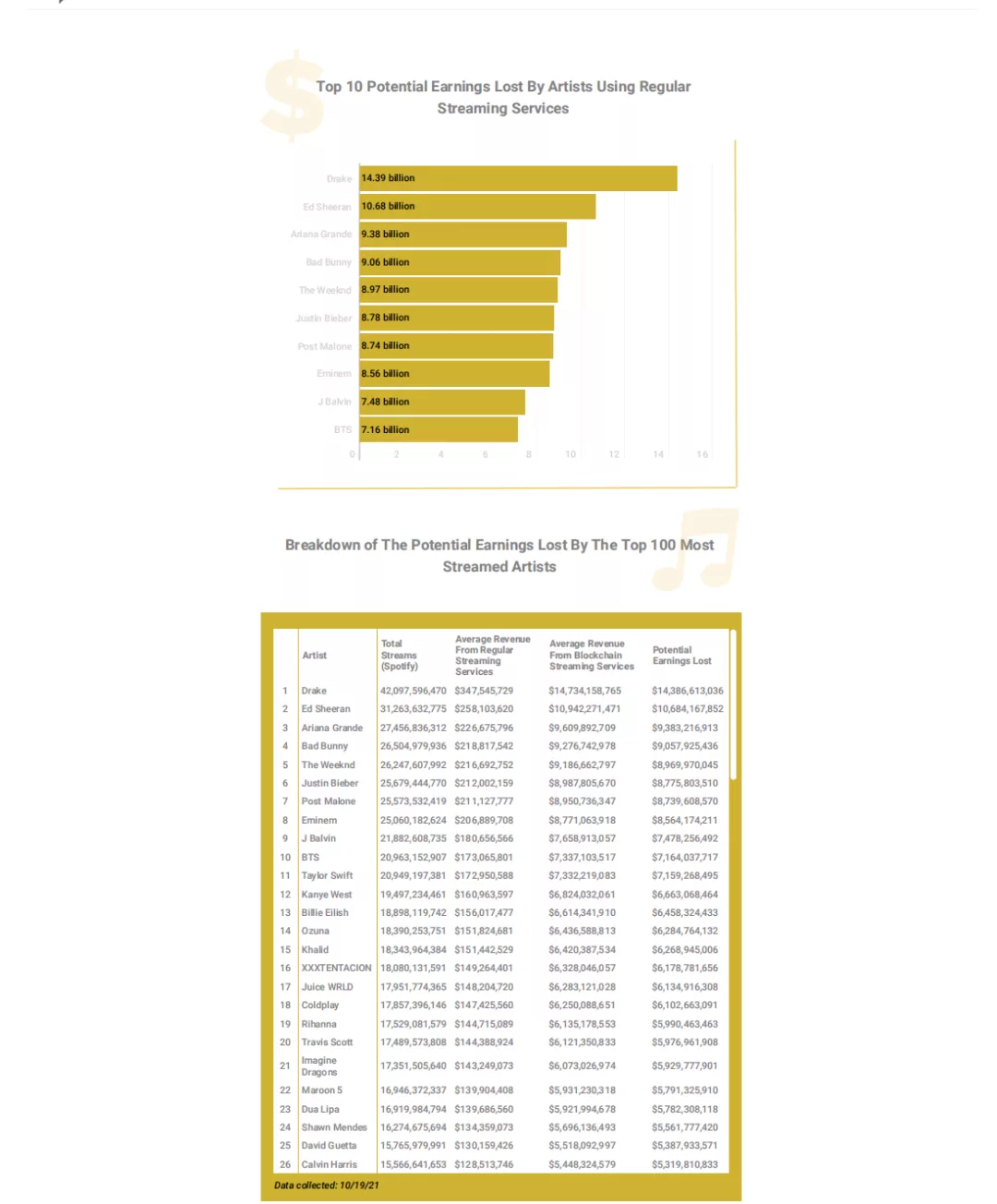 仅看一下排名最高的两位艺术家就足以大致了解潜在的损失。Drake 来自普通流媒体的全部收入略低于3.48亿美元,而来自区块链流媒体公司的收入可能为147 亿美元。这导致其简介损失了143亿美元。流量第二高的艺术家 Ed Sheeran 从普通流媒体中获得了2.58亿美元,而他可能从区块链流媒体中获得了109亿美元的收入,预计减少了106亿美元。