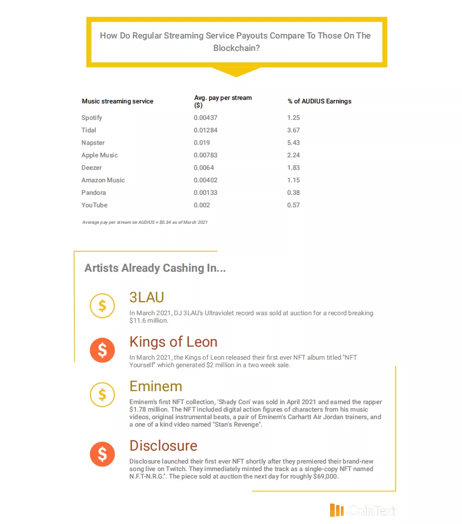 区块链流媒体平台和非同质化代币(NFT) 为音乐交易中的这一长期存在的问题提供了解答,我们需要研究比较的是,相比普通流媒体网站,假如艺术家们的音乐被上传在区块链流媒体网站上,他们可能会提升多少收入?