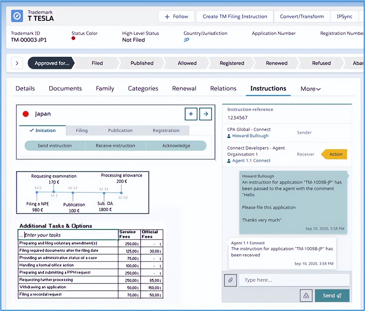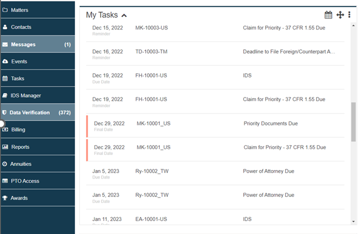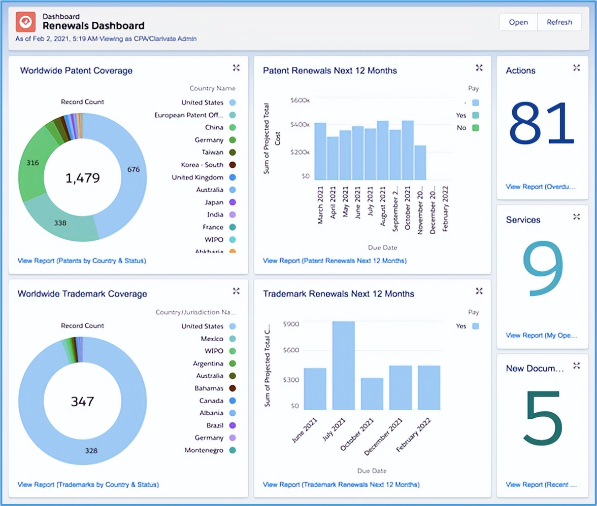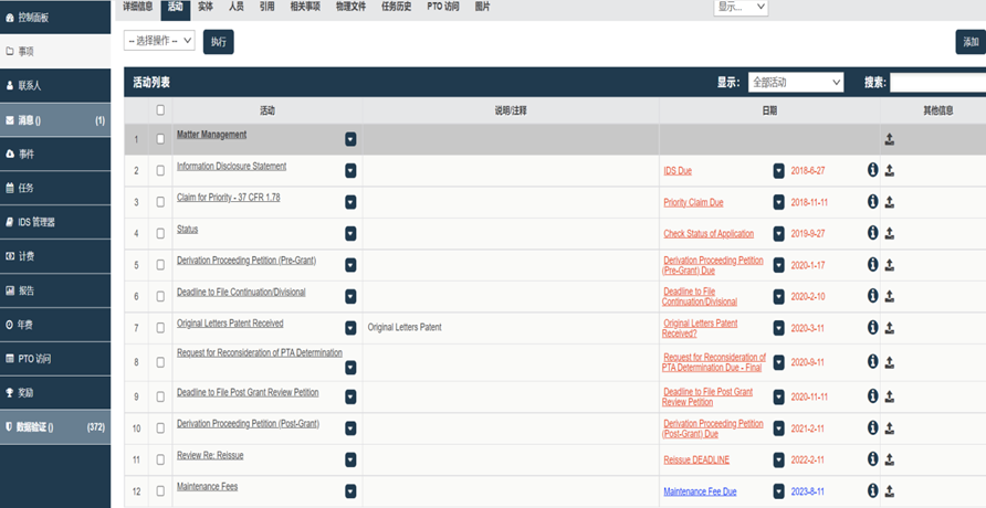 以专利管理为例,专利申请、年费缴纳、续展等各类事项的绝限日期本就繁多,加之各国专利法律制度的不同规定,进一步加剧了管理的复杂度。科睿唯安IPMS可根据内置的自动更新的国家法律信息,自动归档计算专利组合的各种绝限日期,并随之按时间先后顺序派发任务。相关方可在仪表板上查看任务,同时,科睿唯安IPMS强大的任务监督功能将提供自动化任务报告以及接收电子邮件提醒,帮助企业管理好整个IP资产组合中的大量活动。