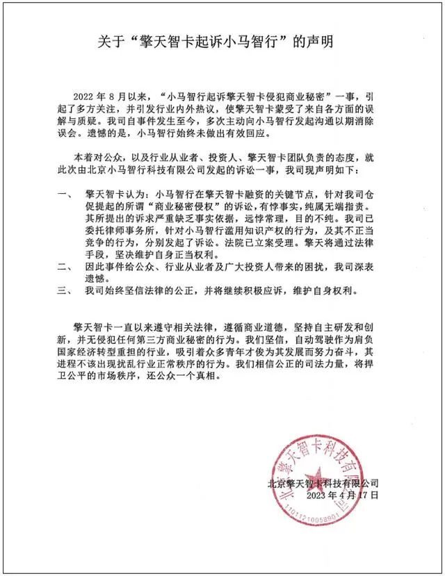 小马智行表示,小马智行前员工潘震皓、孙又晗在离职后创立新公司擎天智卡,从事自动驾驶技术的研发、测试与应用,但研发过程涉嫌侵犯小马智行商业秘密。小马智行作为商业秘密、知识产权的权利人,有权依法维护自身的合法权益,因此于2022年7月向北京知识产权法院提起诉讼。