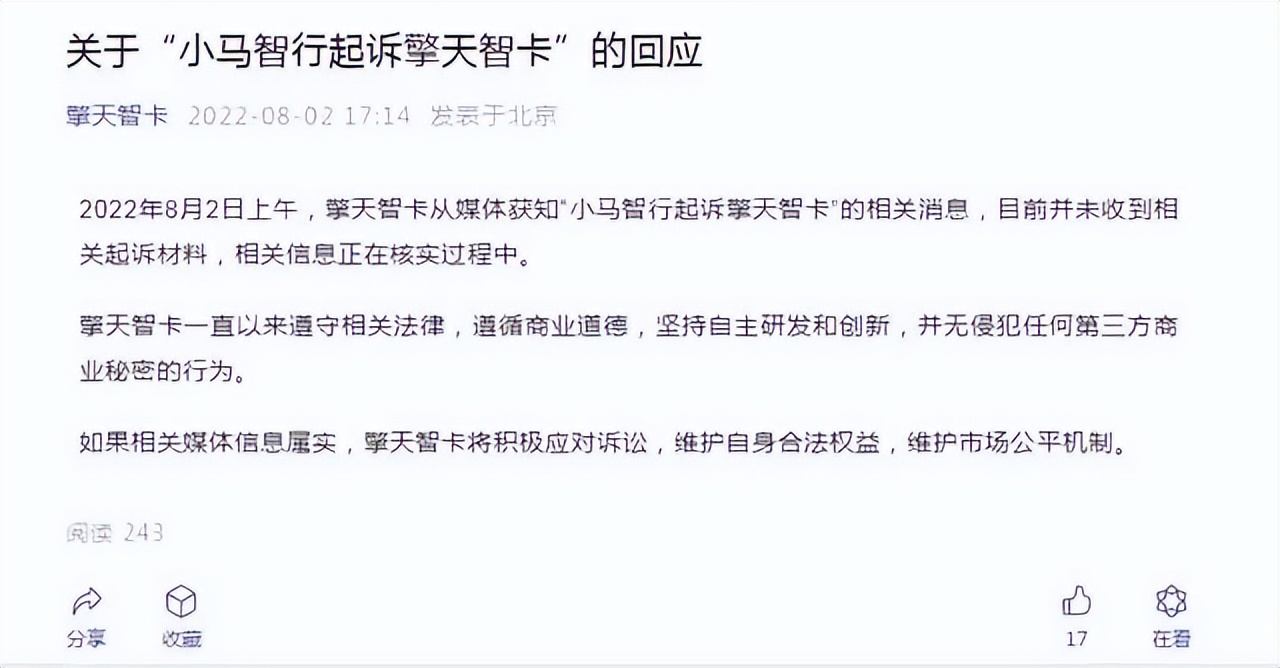 在小马智行宣布公开起诉的同一天,即2022年8月2日,擎天智卡官方发布关于“小马智行起诉擎天智卡”的回应,称目前并未收到相关起诉材料,相关信息正在核实过程中。