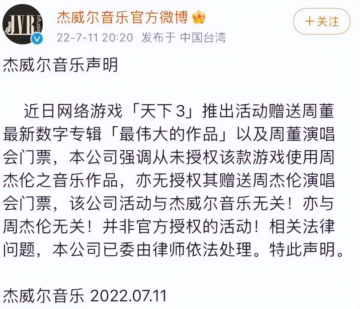 同年7月11日,杰威尔音乐官方微博发布声明,明确表示网易旗下网游《天下3》推出的赠送周杰伦新专辑《最伟大的作品》以及演唱会门票活动,与周杰伦和杰威尔公司均无关,且公司从未授权该款游戏使用周杰伦的音乐作品,相关法律问题已委由律师依法处理。