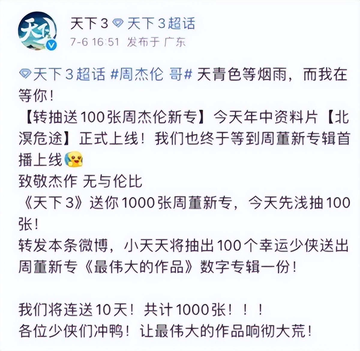 2022年7月6日,周杰伦《最伟大的作品》mv首播,同一天,《天下3》上线游戏资料片,并在微博上发起了一场抽奖活动。“我们将连送10天,共计1000张!”这条微博内容显示,活动以周杰伦的新专辑作为奖品,转发该微博的用户即可参与抽奖。
