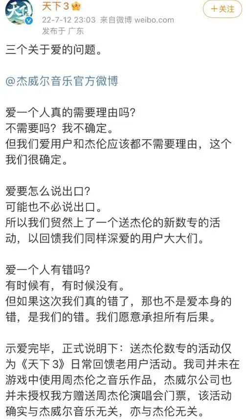 次日,《天下3》官方微博用一则“三个关于爱的问题”的小短文作出回应,表示专辑和演唱会门票是自己买来送给玩家的,只是日常回馈老用户的活动,并不是任何授权活动,也未在游戏中使用周杰伦的音乐作品。