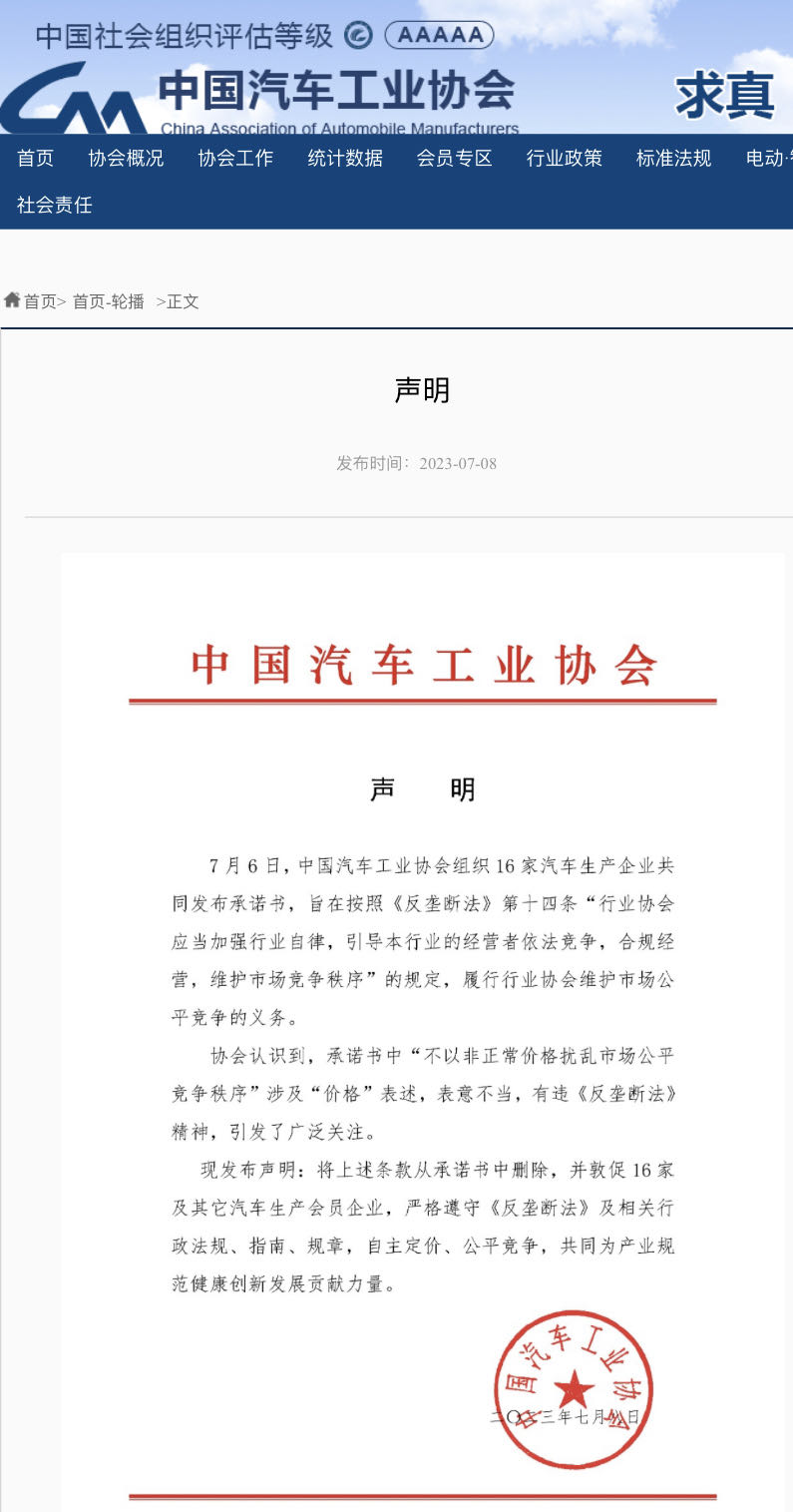 中国汽车工业协会7月7日发表声明称,《承诺书》的本意是想按照《反垄断法》第十四条“行业协会应当加强行业自律,引导本行业的经营者依法竞争,合规经营”,履行行业协会维护市场公平竞争的义务。