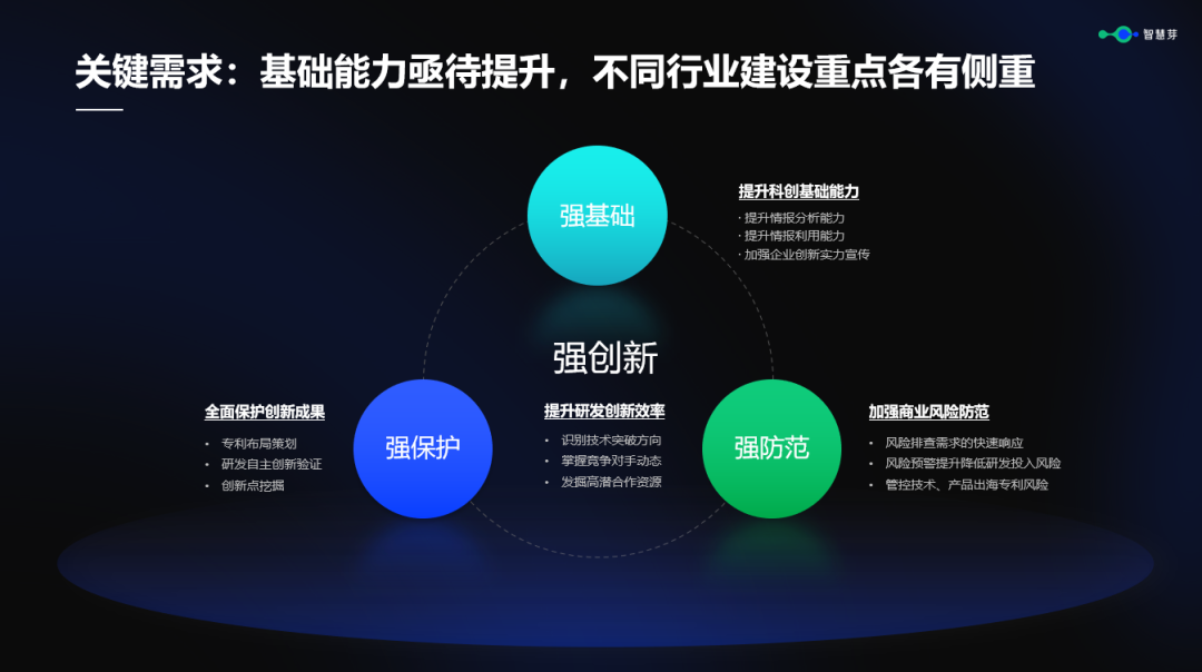 智慧芽中国区总经理朱亚立表示,虽然科技创新企业在提升科创基础能力、全面保护创新成果、加强商业风险防范以及提升研发创新效率的需求方面有一定通用性,但是不同行业建设重点各有侧重。