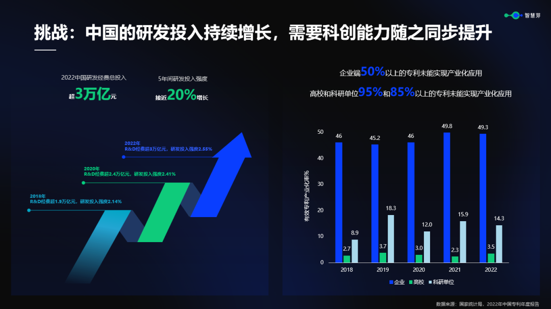 数据显示,2022年中国研发经费总投入超过3万亿元。然而,当前企业端却有50%以上的专利未能实现产业化应用,仍有巨大的提升空间。中国的研发投入持续增长,需要企业的科创能力随之同步提升。
