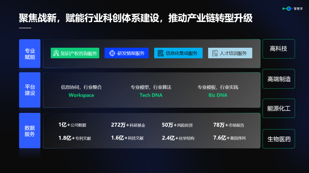 面向新能源汽车、半导体、通信、生物医药以及能源化工等战略性新兴产业,智慧芽推出定制化解决方案,旨在融合智慧芽在数据服务、平台建设、专业服务赋能等方面的优势,推动不同行业的科创体系建设,助力科技企业加速实现创新突破,高效应对技术挑战与市场竞争,进而推动产业转型升级。