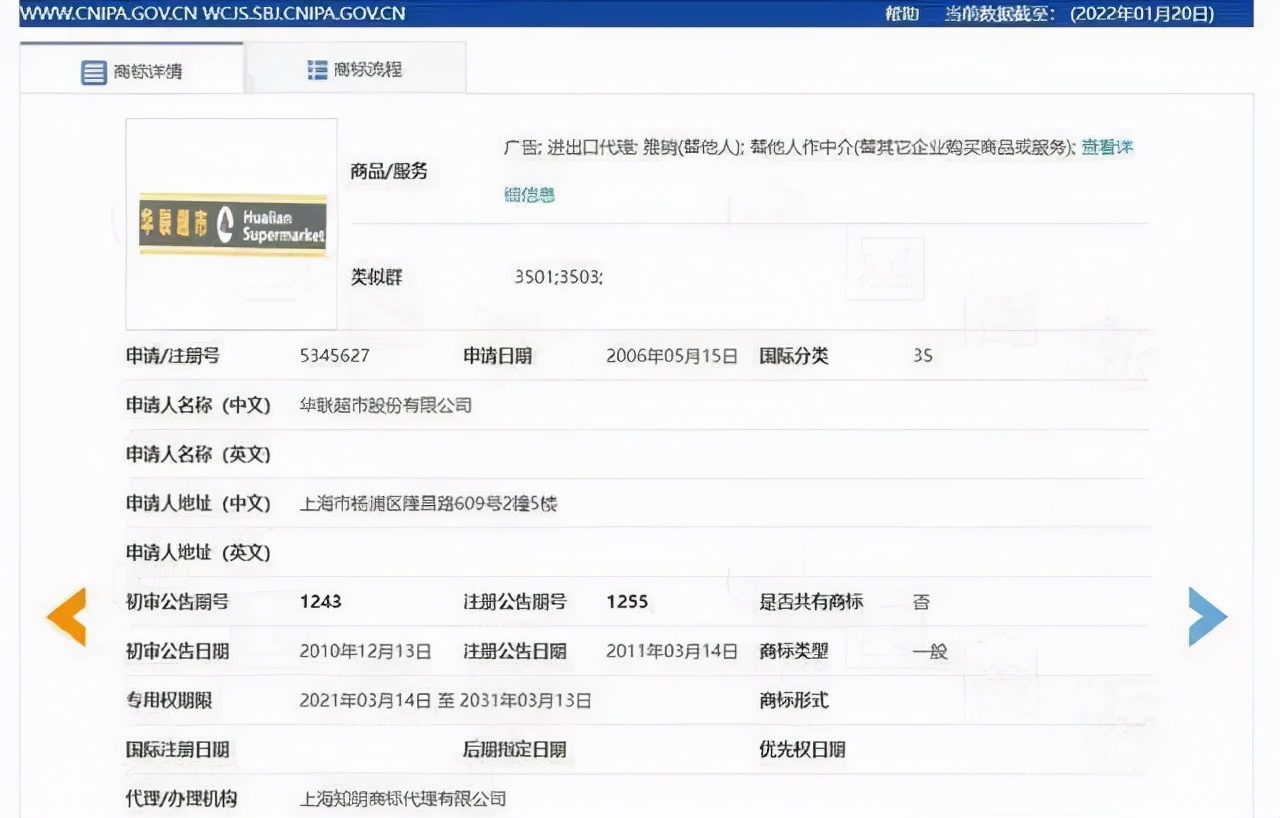 据国家知识产权局商标局、中国商标网显示,该公司于2006年、2007年分别申请注册了两个35类“华联超市”相关商标,其核定服务项目包括:推销(替他人)、替他人作中介(替其它企业购买商品或服务)、开发票、广告等。